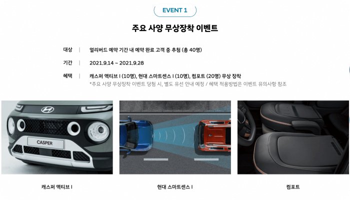 사전예약 이벤트는 9월14일에서 28일까지 예약자를 대상으로 40명을 추첨하여 주요 사양인 캐스퍼 액티브, 현대 스마트 센스, 컴포트 등을 무상으로 40명에게 추첨을 통해 장착을 해줄 예정입니다. 또한 테라로사 커피 드립백 세트 증정외 총 4가지의 이벤트가 진행중인데요 아래 사전예약 사이트에서 추가 확인이 가능합니다.