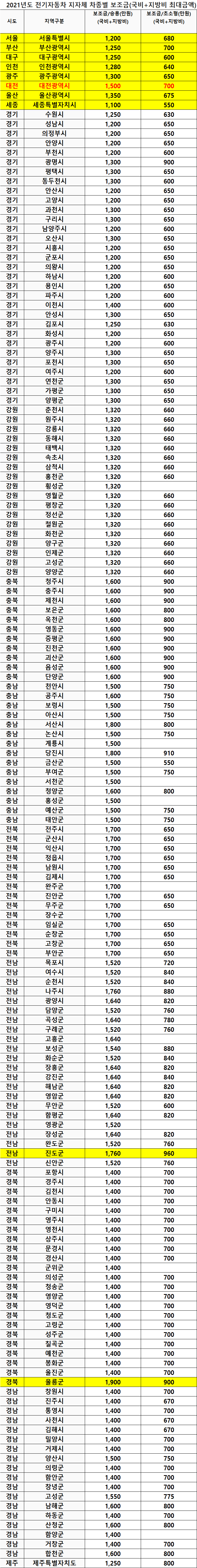 <표> 2021년 전기 자동차 지자체 차종별 보조금 최대 금액 정보를 정리하여 올려 드립니다.