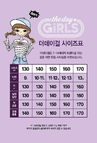 <더데이걸 싸이즈 조견표 -주니어 의류-여아 중심>