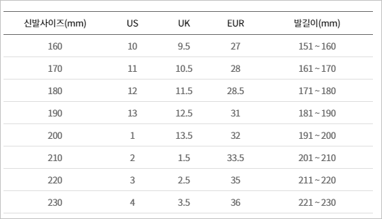 <에어워크 주니어 사이즈 조견표 -주니어 의류>