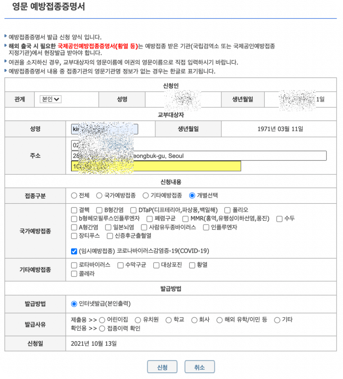 5) 개별 선택에서 코로나 바이러스 감염증을 선택하고 인터넷 발급 본인 출력을 을 선택하고 확인용을 체크하고 신청 버튼을 누르면 됩니다.