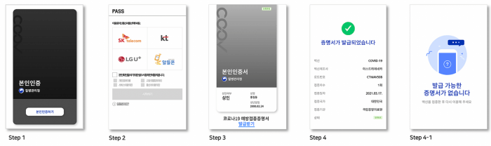 본인인증 카드의 본인 인증하기 버튼을 누르고 이용 중인 통신사 선택 후 휴대폰으로 본인 확인 과정을 진행을 합니다. 본인 인증 이후 코로나 19 예방 접종 증명서 발급받기 버튼을 눌러 줍니다. 질병관리청 데이터에 백신 접종 기록이 확인되는 경우 증명서가 발급되었습니다라는 화면이 나타납니다. 증명서가 바로 발급되지 않는 경우 백신 접종을 하지 않는 경우에는 발급 가능한 증명서가 없다는 화면이 나타납니다.