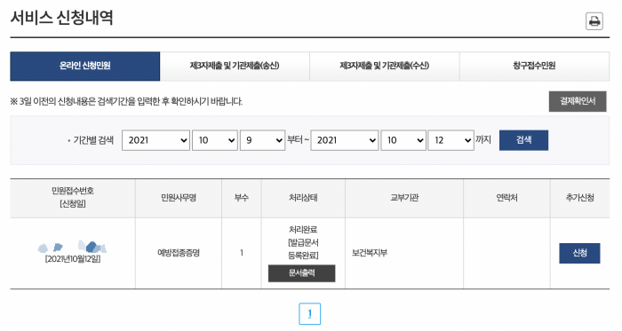 7) 신청하기를 누르고 기다리면 아래처럼 서비스 신청내역으로 넘어갑니다. 프린터가 있는 있을 경우 출력을 하시면 됩니다.