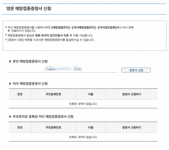 3) 자녀들의 예방 접종은 자녀를 등록을 하면 신청도 가능합니다.