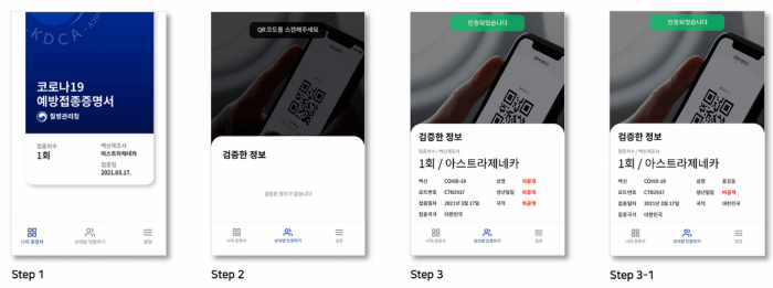 중앙 하단의 상대방 인증하기 버튼을 누릅니다. 그러면 카메라가 활성화되면서 상대방의 큐알코드를 스캔할 수 있는 화면이 나오면 스캔을 하면 됩니다. 인증되었습니다라는 메시지와 함께 상대방의 백신 정보를 확인도 가능합니다.