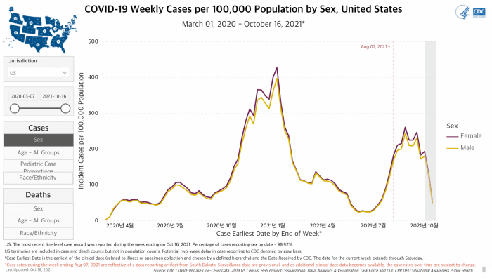 미국의 경우 코로나사망율 그래프 입니다. 10만명당 기준으로 남녀 모두 비슷한 모습으로 보여지고 있습니다.