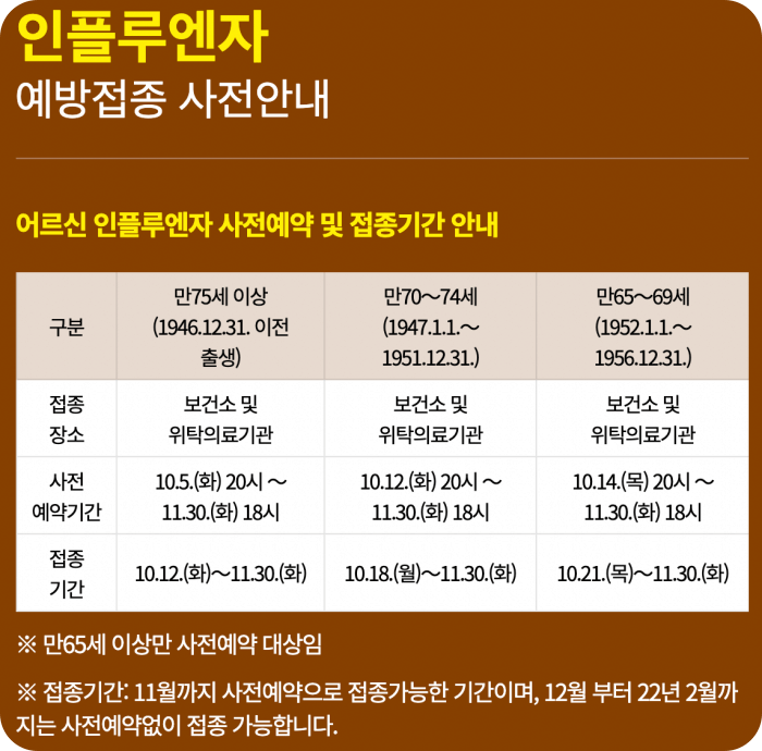 -인플루엔자 1단계 예약 대상 : 만 75세 이상 (1946년 12월 31일 이전 출생자)가 대상이며 10월 5일 오후 8시~11월 30일 오후 6시까지 예약이 진행 중입니다. 1단계 예약 접종 대상자 접종일은 10월 12일 화요일부터 11월 30일 화요일까지 접종을 맞으면 됩니다.