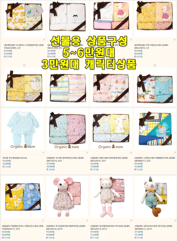 3만원대와 5~6만뭔대로 오가닉맘은 구성을 해 놓았는데요 보통 3~5만원대 선물을 많이 찾는 이유이기도 해서 보통 이 가격대에 맞게 구성을 해 놓아서 가격대 부담을 덜어 놓은 구성입니다. 그리고 중간에는 캐릭터 인형상품도 같이 구성을 해서 누가봐도 선물용인지를 구분이 가능하게 예쁘게 구성을 한 온라인 몰입니다.