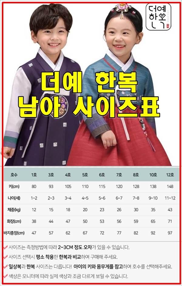 <더예 한복 남아 여아 사이즈표> the-ye.com