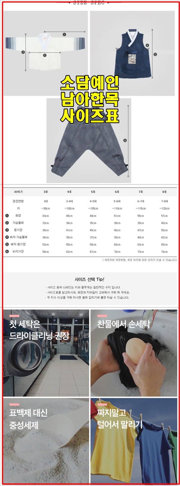 아동한복 소담예인의 사이즈표입니다. 남아 한복 사이즈표입니다. 소담예인에서는 기본적으로 세탁방법을 제공을 해주고 있었는데요 아주 유용합니다. 같이 정리해 봅니다.