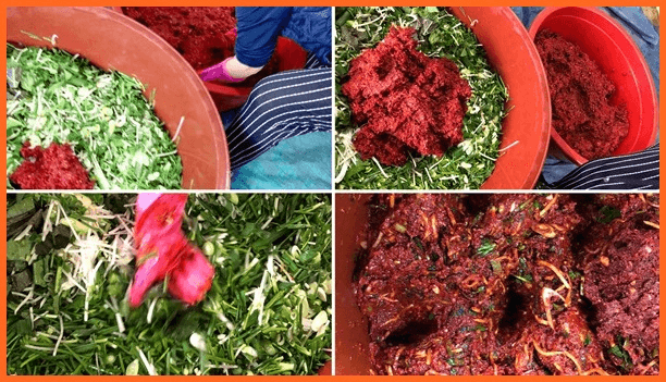 이제 배추 안에 속 양념을 골고루 넣기를 시작합니다. 양념을 많이 넣는 것이 아니라 얼굴에 화장품을 바른다는 느낌으로 양념을 넣기(바르기)를 시작합니다. 이 작업도 시간이 많이 걸려서 손작업 속도가 빠른 사람이 맡아서 하면 좋습니다.