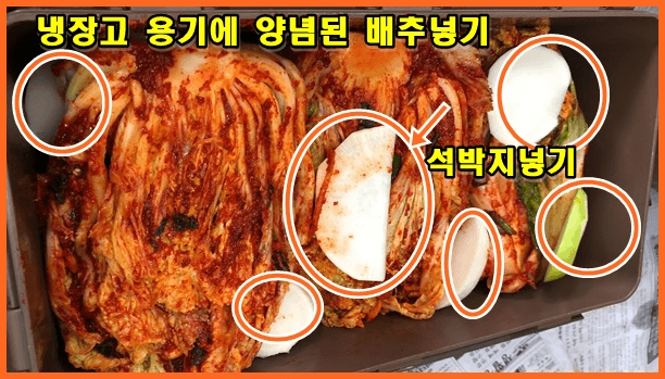 배추김치가 완성될 때 김장용 통에 같이