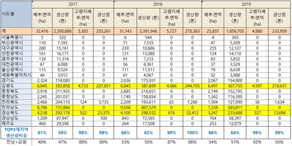 배추 지역별 생산량 출하량 표