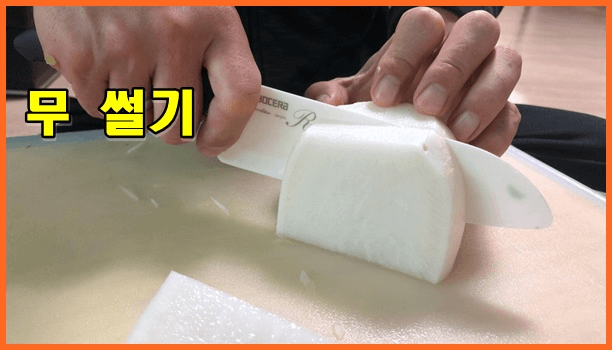준비된 무를 섞박지 썰기를 하거나