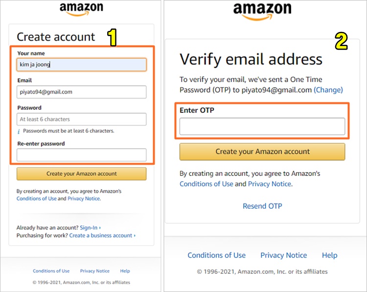 첫 번째로 가입을 하게 되면 가입하고 나면 아마존은 OTP를 넣으라고 표기가 됩니다. 본인이 가입한 이메일로 발송이 되면 해당 이메일로 가셔서 확인 후 찾아서 입력을 하면 됩니다.