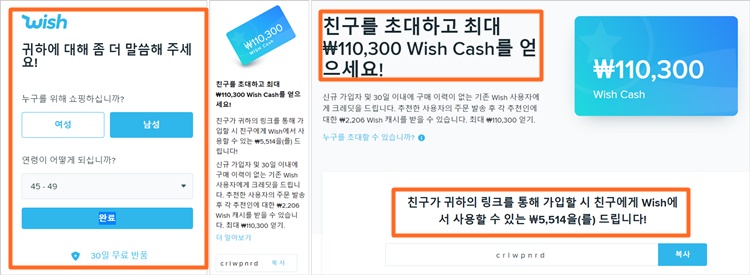 친구에 추천을 통해 친구가 wish에 가입을 하고 구매를 할 때 구매 리워드 코드를 기입해서 사용하면 추천인에게는 리워드가 제공이 되는 프로모션을 하고 있습니다.
