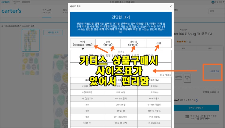 상품 구매 시에는 카터스 아동복 사이즈 표가 같이 볼 수가 있어서 편리합니다.